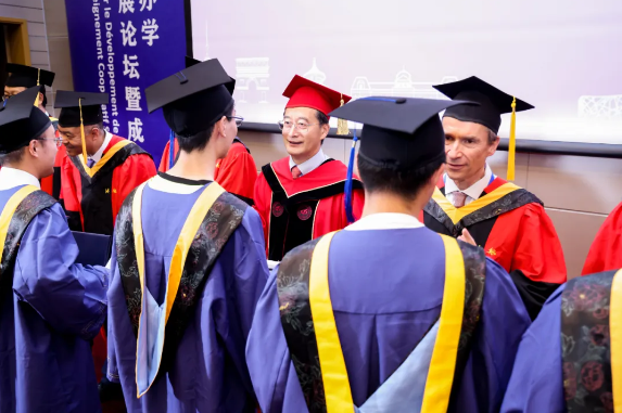Wang Yunpeng and Romain SOUBEYRAN turned the tassel from right to left side and award students a diploma (this is a graduation ceremony).